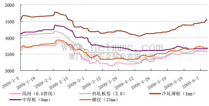 近一個(gè)月來(lái)國(guó)際鋼材價(jià)格處于穩(wěn)定略有上升的趨勢(shì),根據(jù)國(guó)際鋼鐵協(xié)會(huì)的統(tǒng)計(jì)數(shù)據(jù),2009年5月份全球66個(gè)主要產(chǎn)鋼國(guó)和地區(qū)粗鋼產(chǎn)量為9559萬(wàn)噸,同比下降21%,環(huán)比增長(zhǎng)7.4%,5月份全球粗鋼日產(chǎn)量為3083.5萬(wàn)噸,同比下降21%,環(huán)比增長(zhǎng)3.9%,為近7個(gè)月來(lái)最高水平,6月份全球鋼廠開(kāi)工率繼續(xù)反彈。此外,近期數(shù)據(jù)顯示,歐美市場(chǎng)需求有一定的復(fù)蘇跡象,主要鋼材生產(chǎn)企業(yè)開(kāi)始調(diào)高出廠價(jià)格。國(guó)內(nèi)鋼材出口退稅政策調(diào)整之后,部分國(guó)內(nèi)大型企業(yè)已經(jīng)接到東南亞7月出口訂單,訂單數(shù)量接近去年同期水平。我們認(rèn)為,如果這種出口態(tài)勢(shì)能夠持續(xù)的話,將改善國(guó)內(nèi)鋼材的供需情況。
