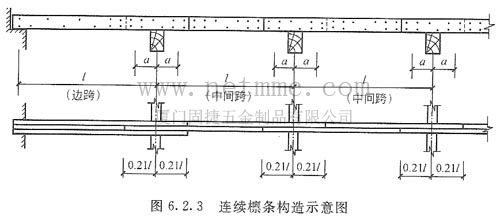 7. 等跨連續(xù)檁條各中間跨采用兩塊木板拼成,兩塊木板的接頭相互錯開,接頭位置設(shè)在距檁條支座O. 2113 l ≈0. 21 l處;在邊跨,考慮彎矩較中間跨大些,可采用三塊木板拼成。圖6.2.3為等跨連續(xù)檁條構(gòu)造示意圖。