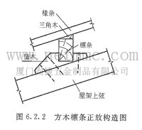 6. 方木檁條宜正放,當(dāng)構(gòu)造上需要時也可斜放。方木檁條正放時,椽條、檁條、屋架上弦等相互之間要墊平卡緊,如圖6.2.20 。