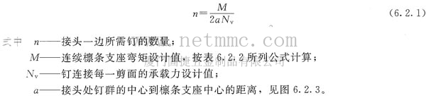 6. 連續(xù)檁條接頭處連接用釘?shù)臄?shù)量按下式計算。