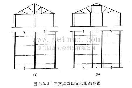 當(dāng)房屋內(nèi)部有縱向承重墻或柱時(shí),應(yīng)把墻或柱用作支點(diǎn),構(gòu)成三支點(diǎn)或四支點(diǎn)桁架圖6.3.3)。設(shè)計(jì)時(shí)應(yīng)以兩榀靜定的單坡桁架為基本體系,而不應(yīng)做成三個(gè)或四個(gè)支點(diǎn)的超靜定結(jié)構(gòu)。