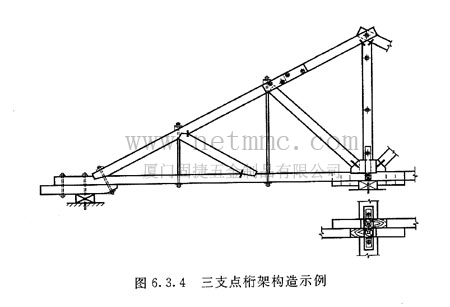 四支點(diǎn)桁架中的兩榀單坡桁架應(yīng)放置在同一垂直平面內(nèi),而在中部?jī)筛⒅戏胖靡粋€(gè)小三角架(圖6.3.3b及圖6. 3. 5)。