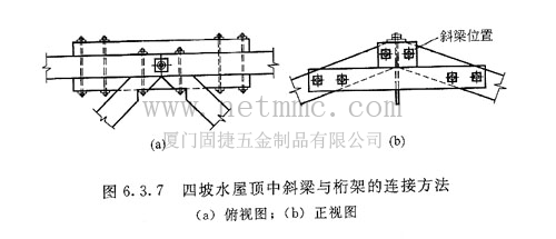 設(shè)計(jì)中尚應(yīng)注意使斜梁頂面的標(biāo)高與三角形桁架的上弦取齊。其連接方法見(jiàn)圖6.3.7。