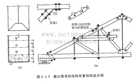 采用這兩種屋面構(gòu)造(圖6.3.6、圖6. 3. 8)皆可達(dá)到改善建筑造型和減小山墻承風(fēng)面積的目的。歇山屋頂?shù)慕Y(jié)構(gòu)簡(jiǎn)沽,施工方便,在一般情況下以采用歇山方案為宜。