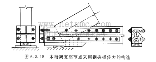 當(dāng)采用方木時(shí)刻槽深不小于20mm,用原木時(shí)刻槽深不小于30mm。采用長夾板下弦接頭方案時(shí),左右二斜桿的水平內(nèi)力差應(yīng)通過與長夾板相連接的螺栓和填木傳遞(參閱圖6.3.14)。
