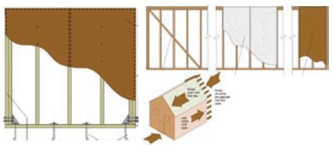 4、經(jīng)工程設(shè)計(jì)建造的木框架建筑,其結(jié)構(gòu)用面板(膠合板或定向刨花板)與墻骨柱組成有效的抗側(cè)向力的建筑組件。