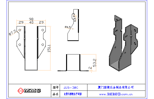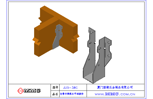 MMC連接件系列,適用于38-40MM的龍骨與橫梁間的連接,廣泛應(yīng)用于各種木屋、木棧道、花架、涼亭等木結(jié)構(gòu)建筑,用于2*8(38*184)的梁的托掛連接件,木屋連接件