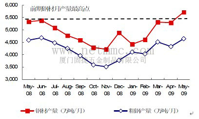 近一個(gè)月來(lái)國(guó)際鋼材價(jià)格處于穩(wěn)定略有上升的趨勢(shì),根據(jù)國(guó)際鋼鐵協(xié)會(huì)的統(tǒng)計(jì)數(shù)據(jù),2009年5月份全球66個(gè)主要產(chǎn)鋼國(guó)和地區(qū)粗鋼產(chǎn)量為9559萬(wàn)噸,同比下降21%,環(huán)比增長(zhǎng)7.4%,5月份全球粗鋼日產(chǎn)量為3083.5萬(wàn)噸,同比下降21%,環(huán)比增長(zhǎng)3.9%,為近7個(gè)月來(lái)最高水平,6月份全球鋼廠開(kāi)工率繼續(xù)反彈。此外,近期數(shù)據(jù)顯示,歐美市場(chǎng)需求有一定的復(fù)蘇跡象,主要鋼材生產(chǎn)企業(yè)開(kāi)始調(diào)高出廠價(jià)格。國(guó)內(nèi)鋼材出口退稅政策調(diào)整之后,部分國(guó)內(nèi)大型企業(yè)已經(jīng)接到東南亞7月出口訂單,訂單數(shù)量接近去年同期水平。我們認(rèn)為,如果這種出口態(tài)勢(shì)能夠持續(xù)的話,將改善國(guó)內(nèi)鋼材的供需情況。