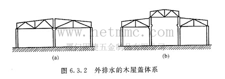 當(dāng)木桁架不多于兩跨或三跨時(shí),如有條件,可做成外排水的木屋蓋體系(圖6.3.2),并利用側(cè)窗采光。