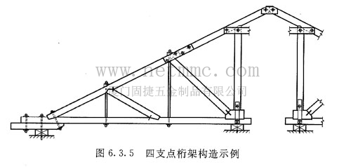 四支點(diǎn)桁架中的兩榀單坡桁架應(yīng)放置在同一垂直平面內(nèi),而在中部?jī)筛⒅戏胖靡粋€(gè)小三角架(圖6.3.3b及圖6. 3. 5)。