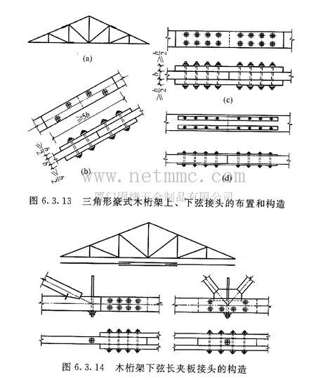 下弦接頭不宜多于兩個(gè)。通常采用一對木夾板連接并以螺栓傳力。接頭每端的螺栓數(shù)由計(jì)算確定,但不宜少于6個(gè)。木夾板厚度應(yīng)不小于下弦寬度的一半,當(dāng)桁架跨度較大時(shí),木夾板厚不宜小于100mm,其長度按螺栓排列間距的要求確定。螺栓通常按兩縱行齊列布置(圖6.3.13c)。當(dāng)下弦高度較小,兩縱行齊列有困難時(shí),可按兩縱行錯(cuò)列布置。采用原木時(shí),嚴(yán)禁沿下弦軸線單行排列布置螺栓。下弦木夾板應(yīng)選用優(yōu)質(zhì)的氣干木材制作,如不能取得符合要求的木夾板時(shí),則可改用兩對鋼夾板連接(圖6. 3.13d),鋼夾板厚度不應(yīng)小于6mm,若采用一對鋼夾板,則鋼板勢必約束下弦木材的橫紋干縮,而促使木材開裂。
