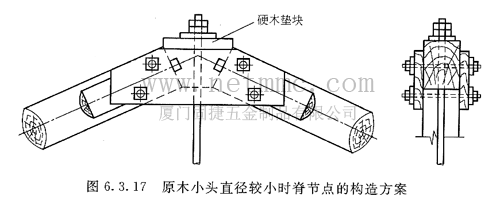 脊節(jié)點(diǎn)處上弦應(yīng)相互抵承,用木夾板以螺栓系緊。其構(gòu)造要求與上弦接頭基本相同(圖6.3.16a)。原木桁架當(dāng)小頭直徑偏小,上弦端頭相互抵承面積不足時(shí),可采用加設(shè)硬木墊塊的構(gòu)造方案(圖6.3. 17)。