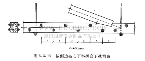 當(dāng)下弦總長度比木材兩根的長度之和大得不多時(shí),可采用長夾板的連接方法(圖6.3.14)。與在跨中左右兩個(gè)節(jié)間內(nèi)各設(shè)一個(gè)下弦接頭相比較,這樣可以簡化構(gòu)造并節(jié)約材料。